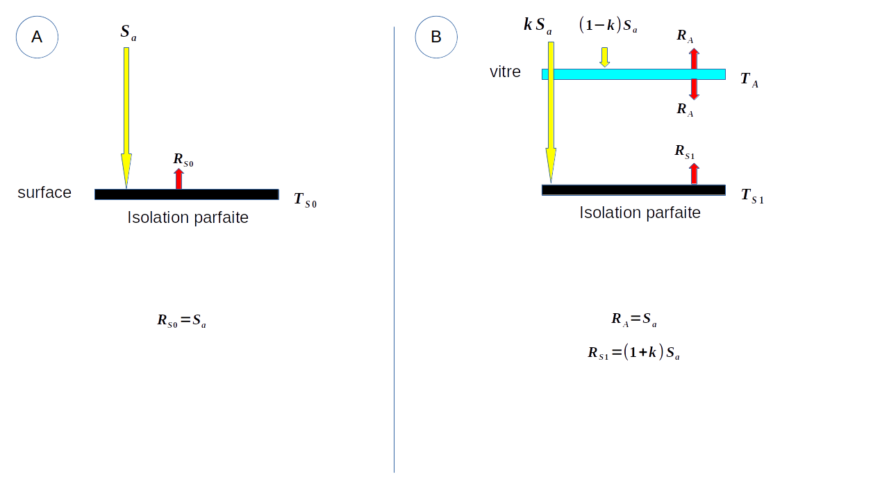 Ce modèle produit des valeurs trop élevées de température de surface. Un paramètre k décrivant le degré de transparence de l’atmosphère est introduit. Il permet d’ajuster ce modèle aux observations. Voir Fig. 1.